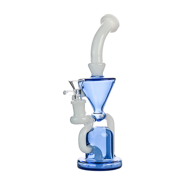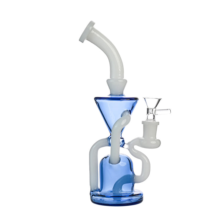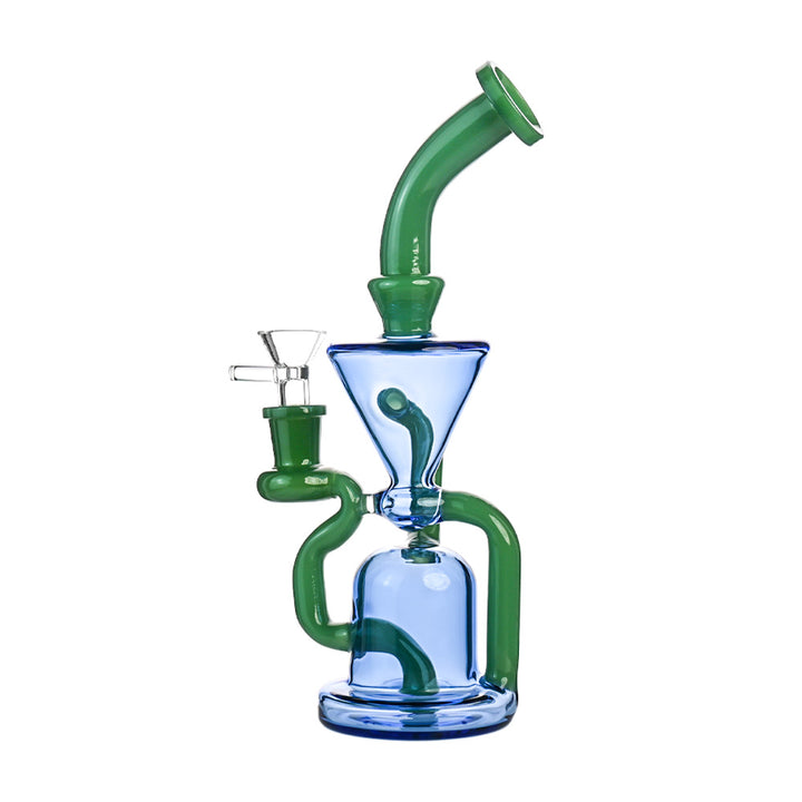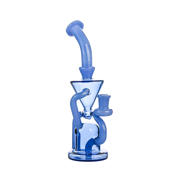 The recycler loop pulls water up through the funnel and down again into the base—circulating continuously for cooler, cleaner hits without splashback. A flared bent neck provides a comfortable draw angle, while the thick base keeps the piece weighted and stable during use.