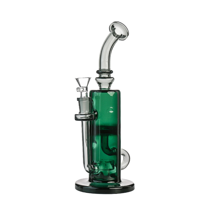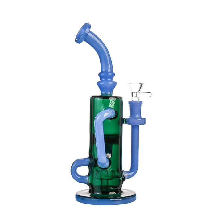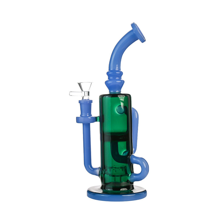 This 10-inch recycler-style bong combines a tall cylindrical chamber with a precision showerhead perc, delivering cool, controlled filtration with every hit. The curved bent-neck mouthpiece keeps splashback away, while the dual-color glass accents in Blue/Teal and Black/Teal create a modern, collectible aesthetic.