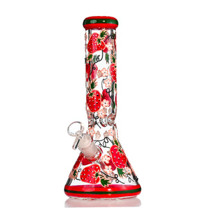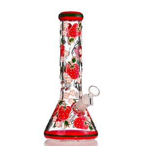 This 13-inch beaker bong features a charming strawberry and cherry blossom theme, with bright red strawberries, soft pink flowers, and green vine detailing wrapping the entire body. Crafted from thick borosilicate glass, it combines cute aesthetics with reliable daily performance. The classic beaker base delivers smooth diffusion and a sturdy, easy-to-use design.