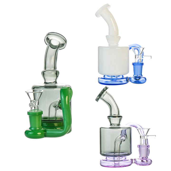 Despite its small footprint, this rig performs like a full-size recycler—perfect for everyday use, travel sessions, or concentrate lovers who prefer dense, terp-rich hits without harshness. Available in three artistic colorways blending clear borosilicate with bold colored accents.