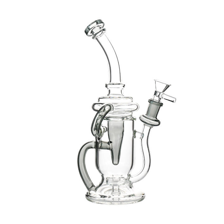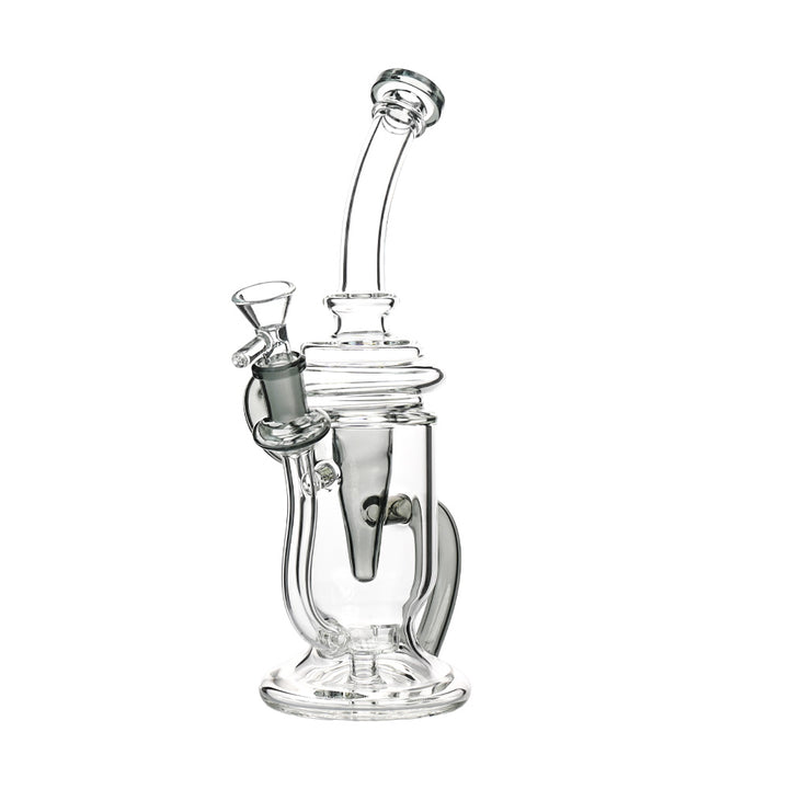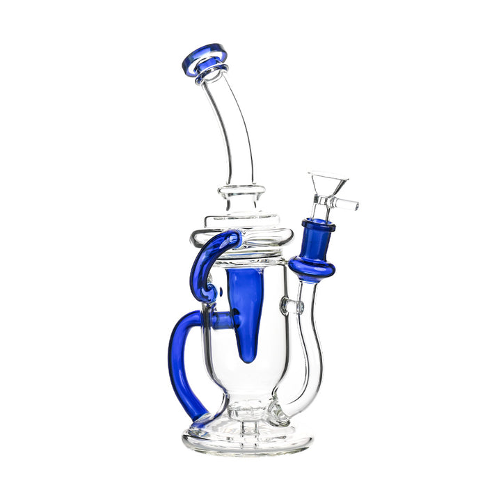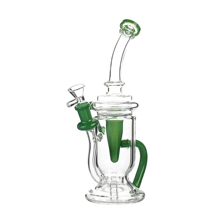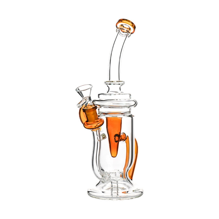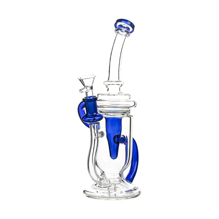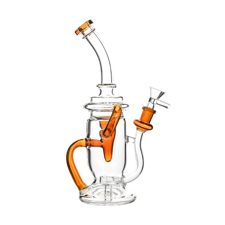 This 9-inch recycler bong brings premium function into a compact, colorful silhouette. Built around a tall bent neck, fixed downstem, and a prominent internal recycler cone, this piece pulls vapor through the lower chamber before cycling it back up for a smoother, more refined hit. The continuous recycling motion cools the vapor while reducing harshness — perfect for users who want clean flavor in a smaller, easier-handling size.