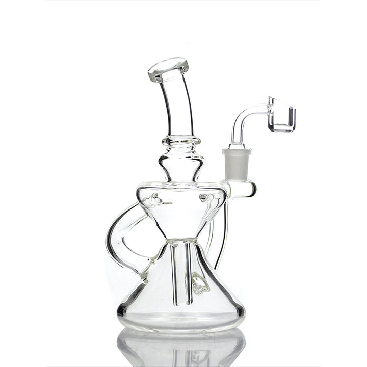 This 5-inch clear dab rig packs surprising performance into a small, travel-friendly body. Built with a wide funnel-shaped chamber and looping recycler-style tubing, it pulls vapor smoothly while keeping each hit dense and flavorful. The angled neck offers a comfortable draw, while the flared base keeps the rig stable despite its compact height.
